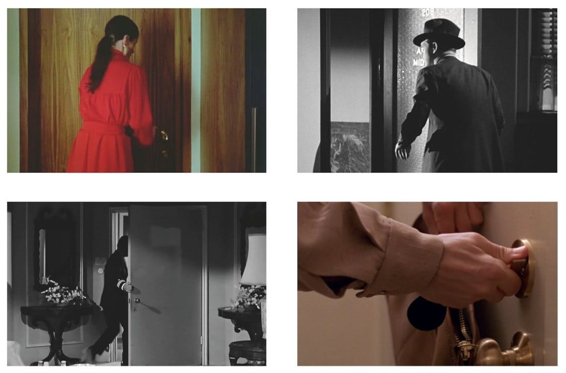 But as I came to learn the rules of the game—which Marclay bends, at times, allowing a protagonist to pass through a door intact, or using a flashlight as a metaphorical door into another world—I began to feel safer. Reality is eternal and predictable; every door leads somewhere; we can always return and always will. The presiding affect of Doors is comic, not tragic: chase sequences take on a Keystone Cops quality, and every cut is a visual joke, sometimes amplified by an auditory one, as sounds from one world—music, an alarm or siren—leak into another.